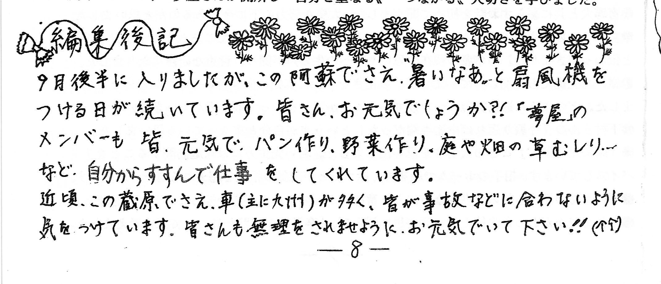ようやく朝晩 涼しい風が吹くようになった頃、このお便りを書いています。