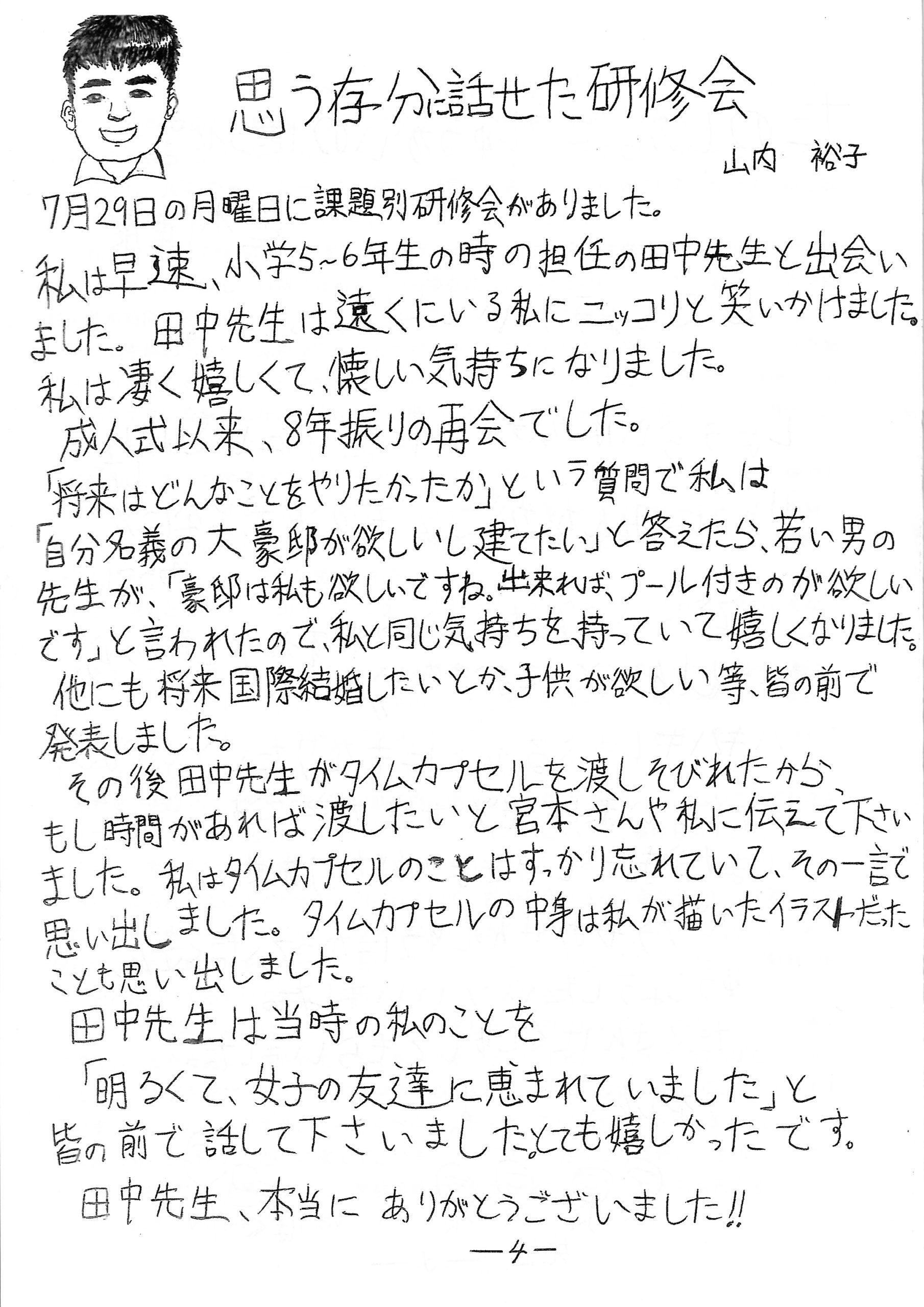 さて今回は毎夏、阿蘇市の学校職員の皆様を対象に行われています人権・同和教育課題別研修会(7/29)の感想の抜粋をお載せしています。感想内容もさることながら、その中に同期採用の方が数人おられ、私が教職を辞した時から気にされていたというお言葉を頂戴し、『ともに同じ初任者研修を受けた関係はありがたいものだなあ』と感じ入ったところです。また参加者されたすべての方から貴重なご意見、ご感想をいただき、夢屋を開所して30年、〝教職〟とは道を別にしましたが、<共生>を基本に置いた広い意味での「教育」、そして進路保障としての「就労」に携わる身として気持ちを新たに、初心に帰る思いがした有意義な研修会でした。