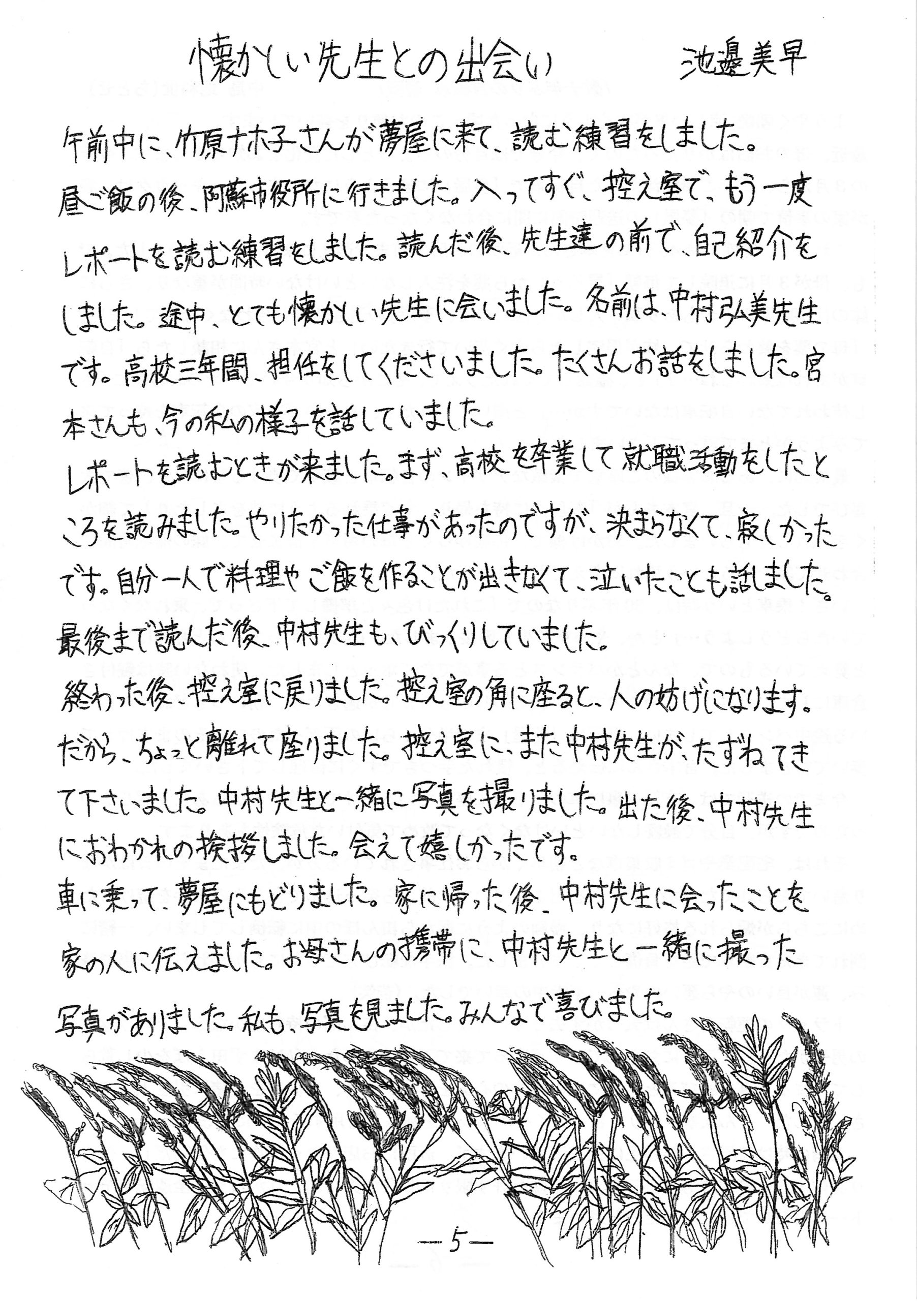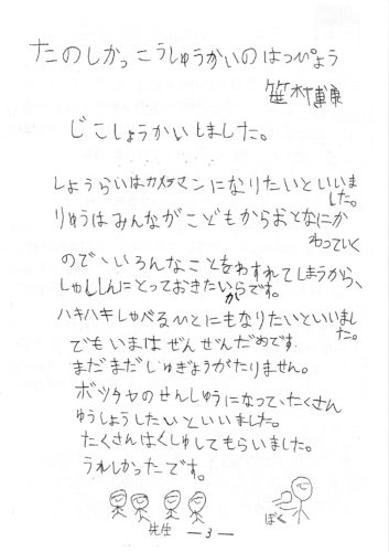●つづりを本人が読んでくれ心に響きました。竹原先生が以前、つづりを書くことは思考を育てることと言われていて、メンバーそれぞれの思いや生活が大事に表れていると思いました。