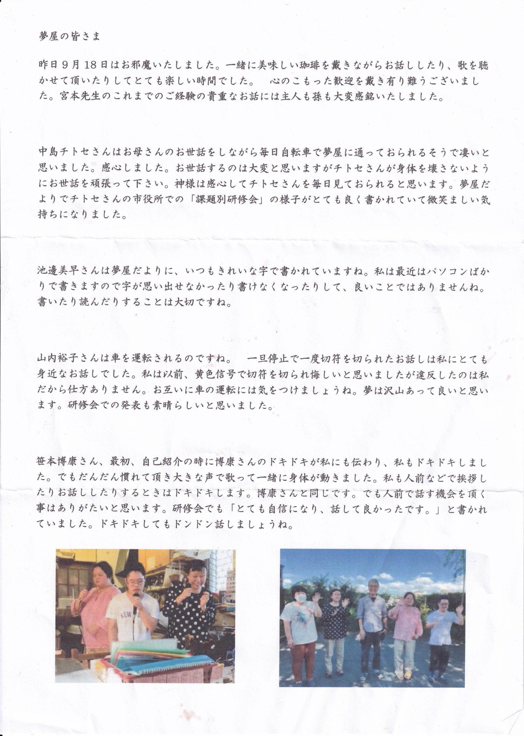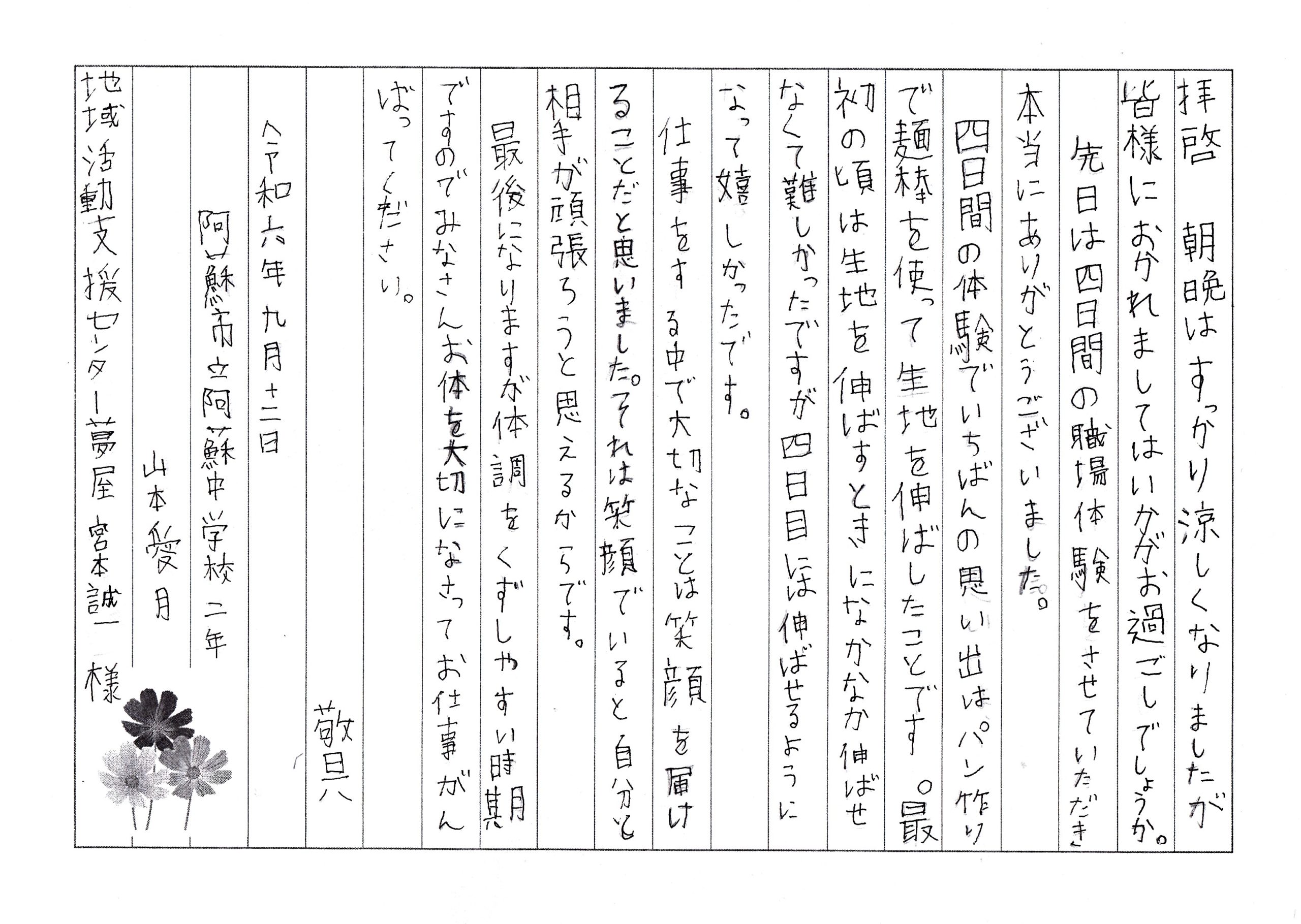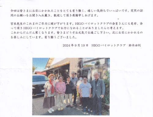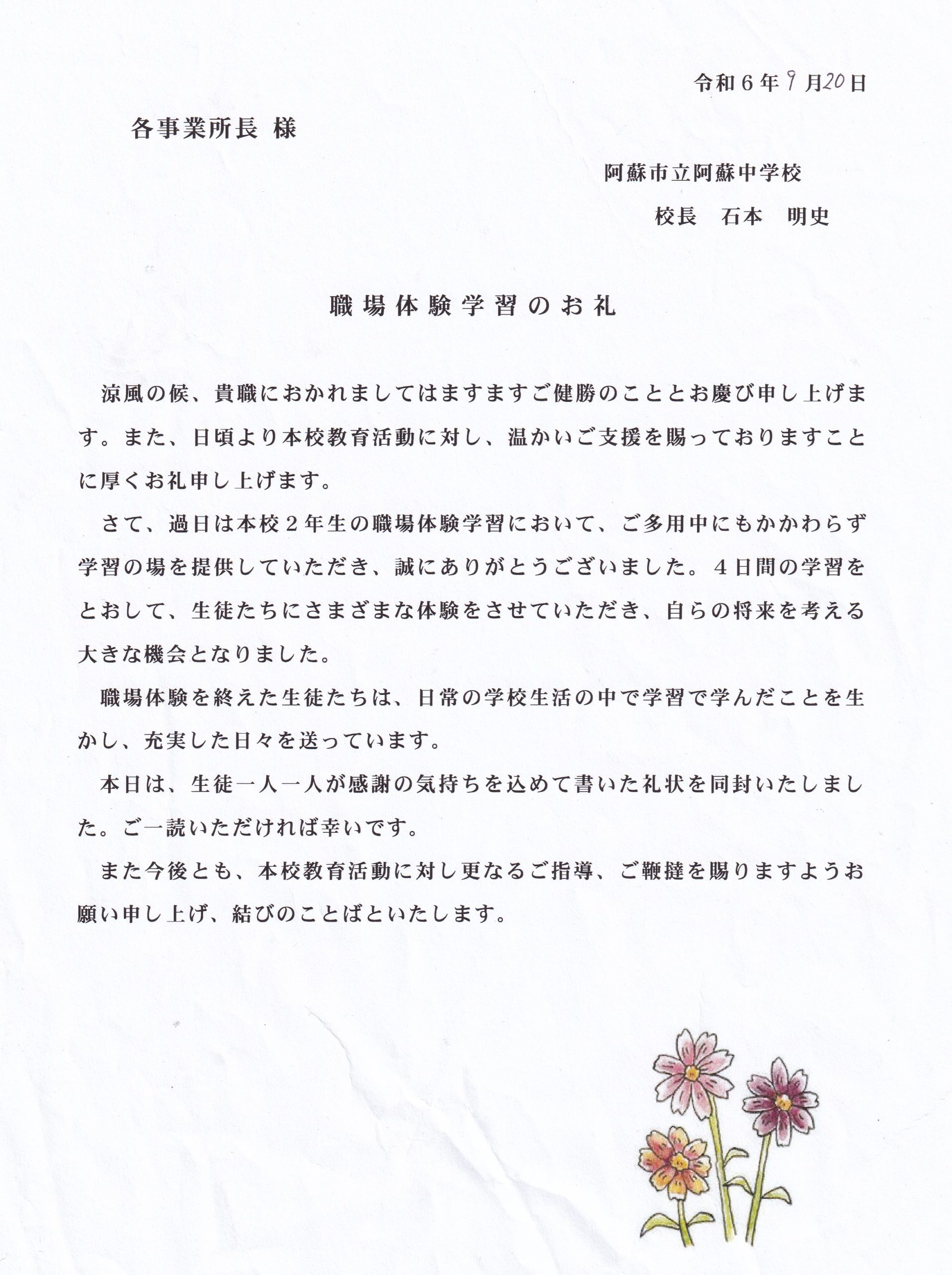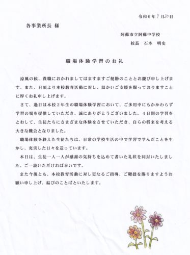 阿蘇中学校から職場体験のお礼文と生徒さんのお手紙を頂きました。またHIGOパイロットクラブ会長の鈴木様からもお礼文を頂きました。お忙しい中に、本当にありがとうございました。