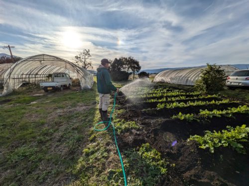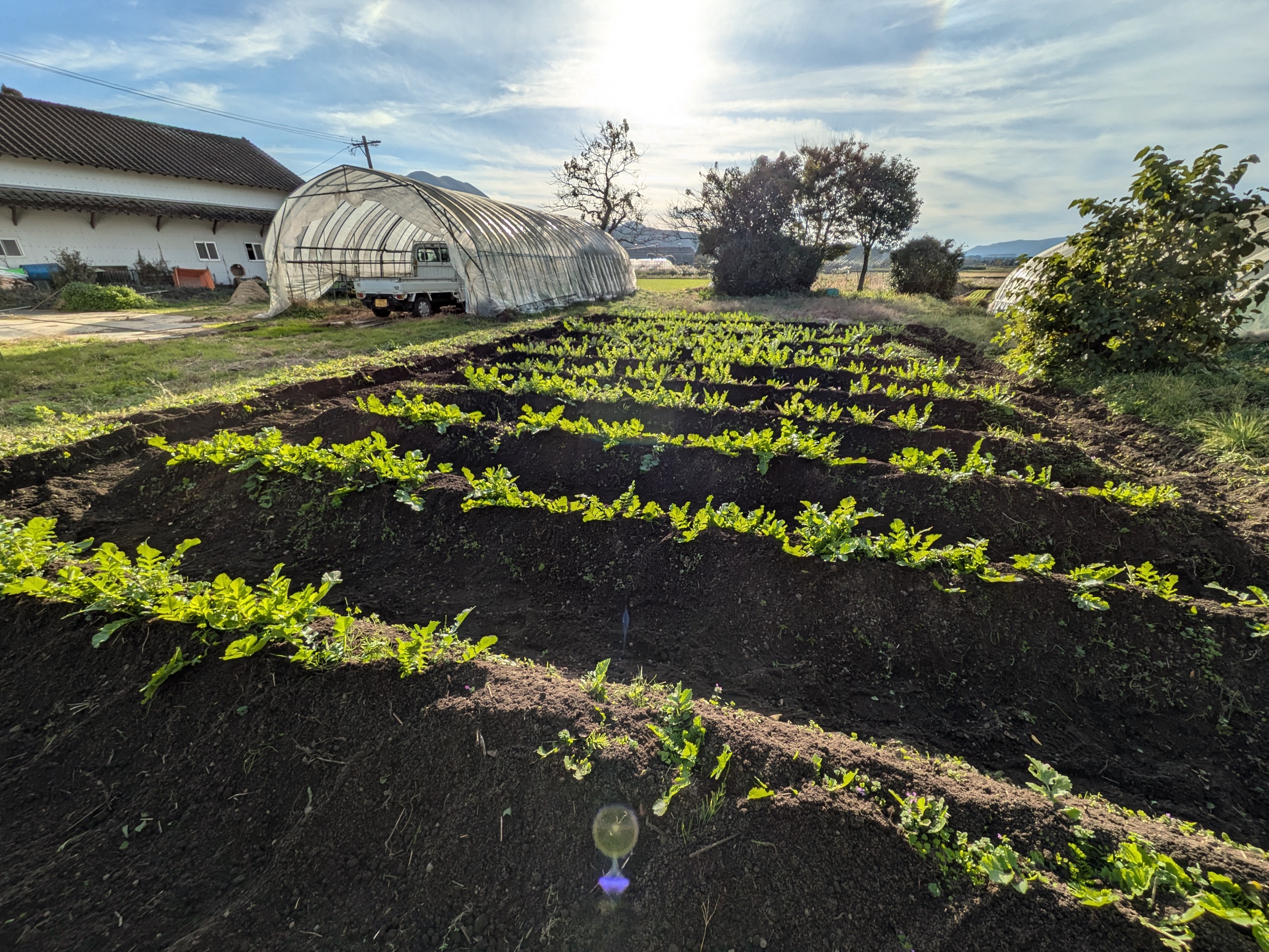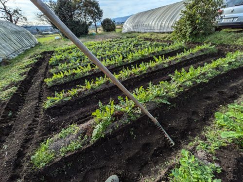 児童の皆さんが無事に登校したあとは、大根の追肥と土かぶせをしました。