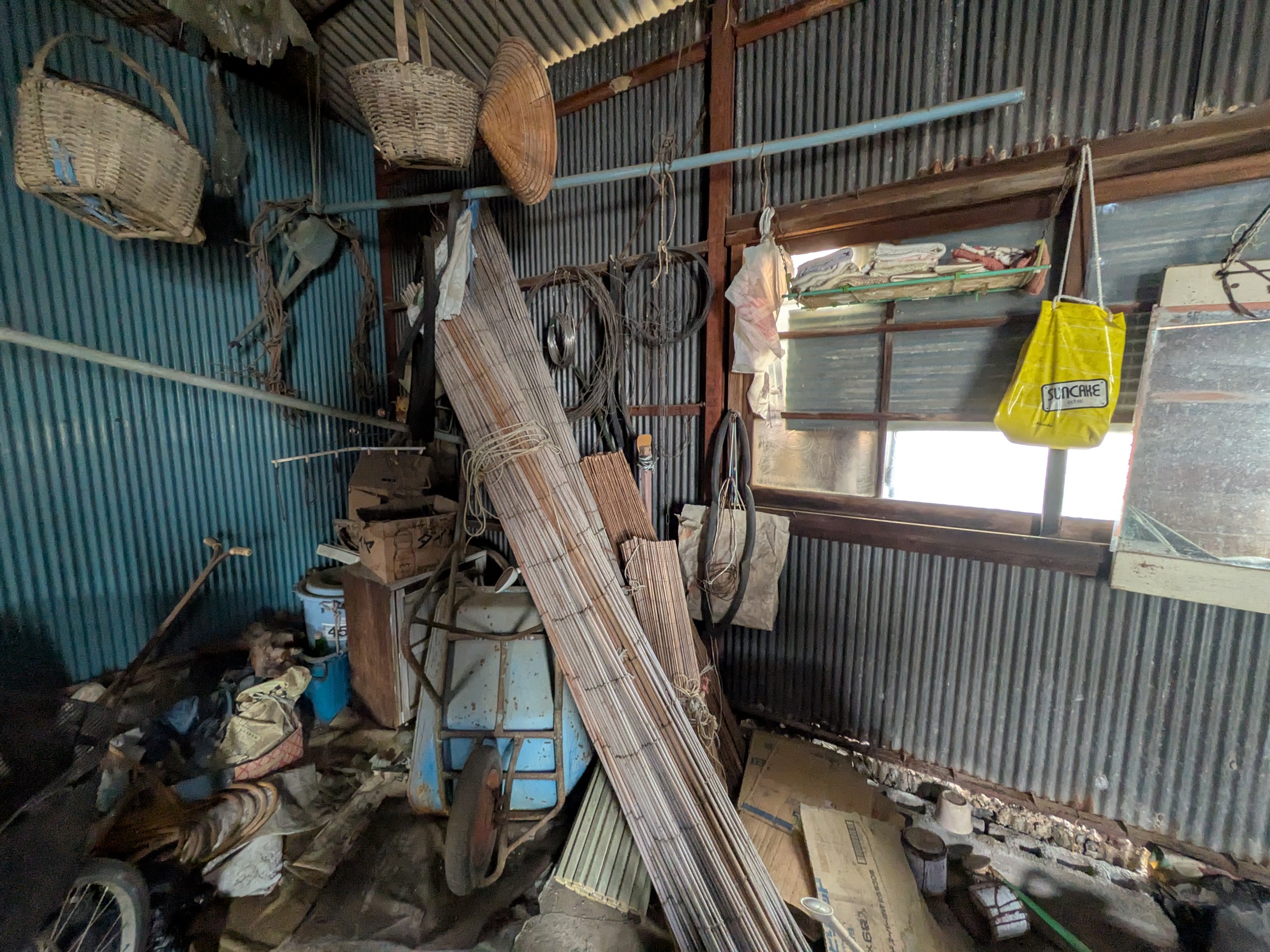 かつて海苔の養殖をやっていた頃使われていた実家の作業小屋です。通称『かんそ小屋』“かんそ“は『乾燥』の意味です。オイルショックで灯油が値上がり、次なる機械化の波にもついていけず、あえなく中3のとき廃業となりました。毎年、シーズン中には夕方から8時、遅いときは10時頃まで手伝いをしていた私は(潮の干満に合わせ有明海へ船を出し、リヤカーで積まれた海苔を運んでくる親の苦労も知るところなく)正直ホッとしたしだいです。(夢屋代表 宮本誠一)