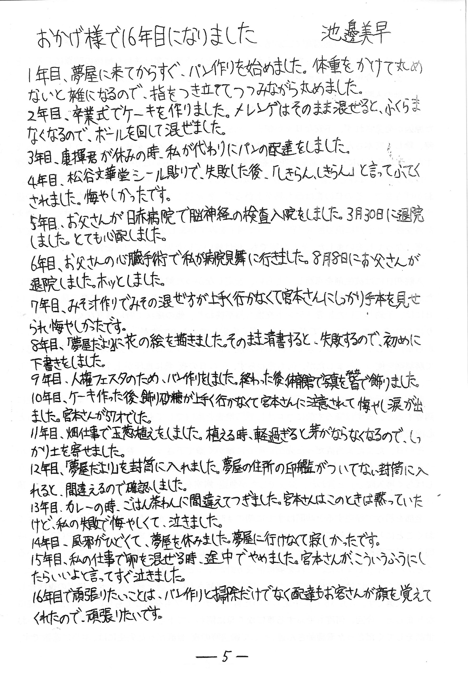 また、4月14、16日は熊本地震から9年目を迎え、県内では様々な形での慰霊行事があったようです。夢屋でも市役所のサイレンに合せ、メンバー、スタッフ全員で黙祷を捧げました。当時の様子をメンバーや保護者から聞き取り、被災から一月後に発行した『夢屋だより(臨時号)』もHPに再掲載し、私自身、再読することであの日を振り返っています。まずは忘れない事。それが尊い御霊に報い、記憶を風化させない意味でも大切なことと思っている次第です。